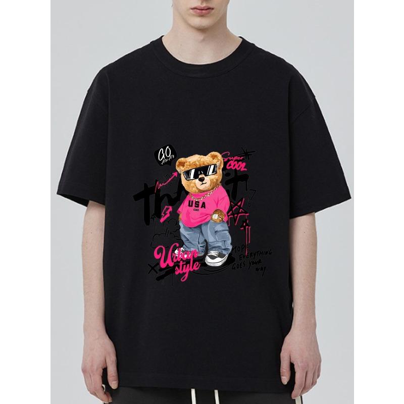 Black T Shirt with Bear Graphic and Pink Text Print for Casual Wear