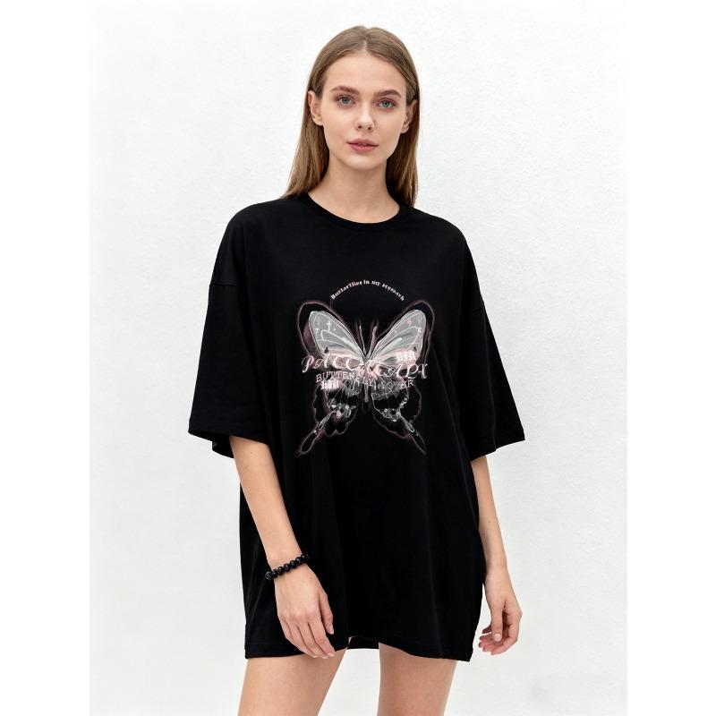 Oversized T Shirt Black Butterfly Print With Text Graphic Women Casual Streetwear Fashion Top Summer Outfit