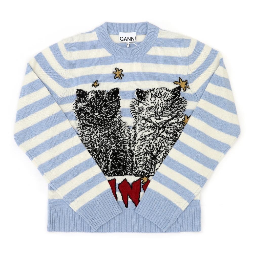 Ganni K2369 628 Cat Graphic Logo Wool Mix Stripe Women S Knit