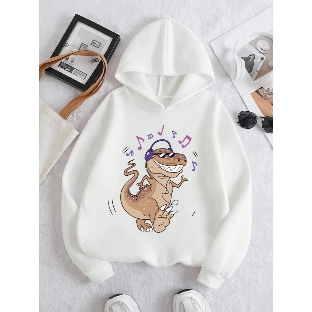 Autumn Casual And Fashionable Children's Dinosaur Listening To Music Cartoon Pattern White Hooded Sweatshirt