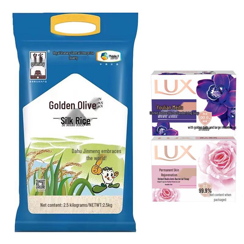 This unique combination set features LUX scented soaps and Royal Granary Golden Olive Scented Rice. The 100g soaps, with nourishing Rose and Lotus flower scents, are perfect for daily use. Complementing this, the 2.5kg Royal Granary rice provides a quality staple. This family pack offers a convenient solution, originating from Mainland China, and has a 3-year shelf life.