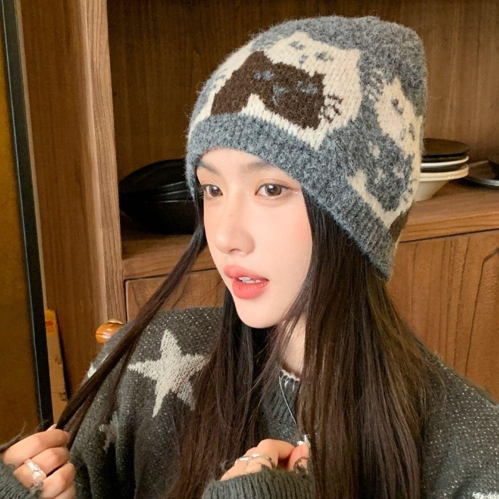 Fair Isle Style Jacquard Cat Knitted Hat Warm Printing Knit Cap Jacquard Pattern Beanies Outdoor