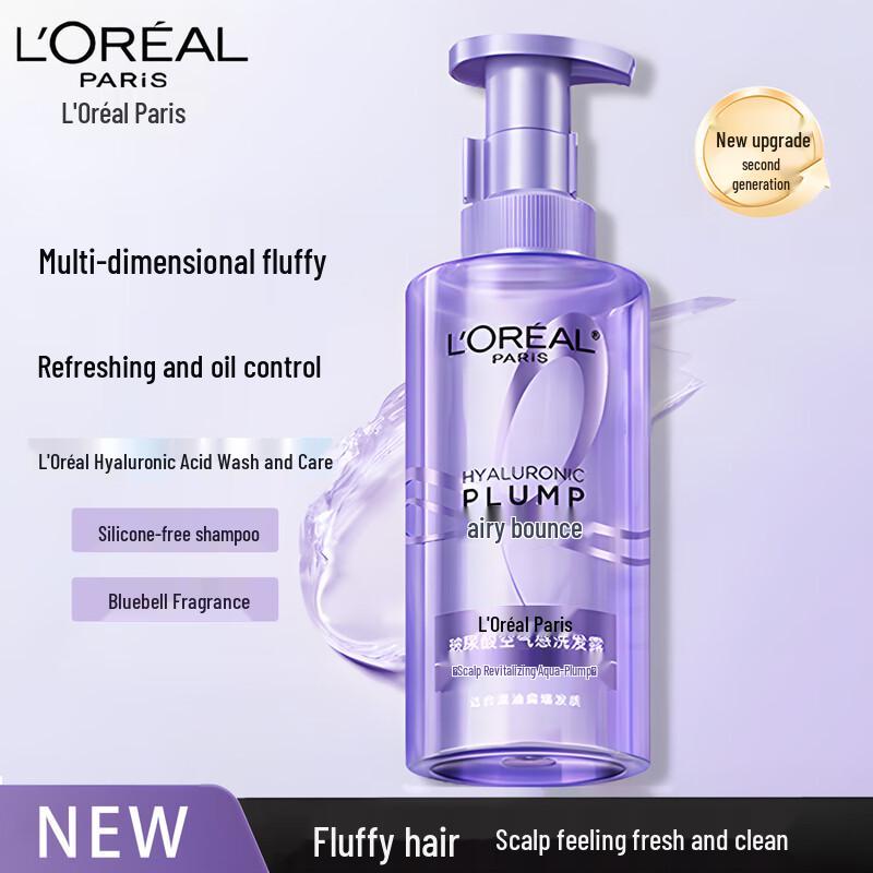 Achieve voluminous, oil-free hair with L'Oreal's Hyaluronic Air-Volume Shampoo. This 440ml formula deeply cleanses, controls oil, and provides an airy, bouncy feel, leaving your hair refreshed and smooth. Suitable for all hair and scalp types.