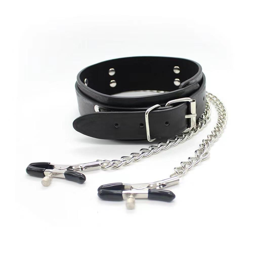 Women's Erotic Nipple Clamps and PU Choker with Iron Chain Restraint Set