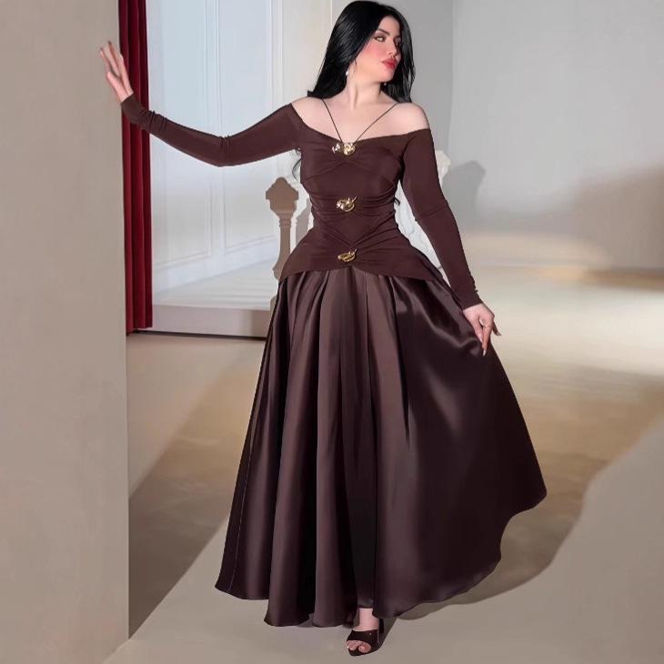2025 Autumn European & American One-Shoulder Solid Color Long Dress for Women