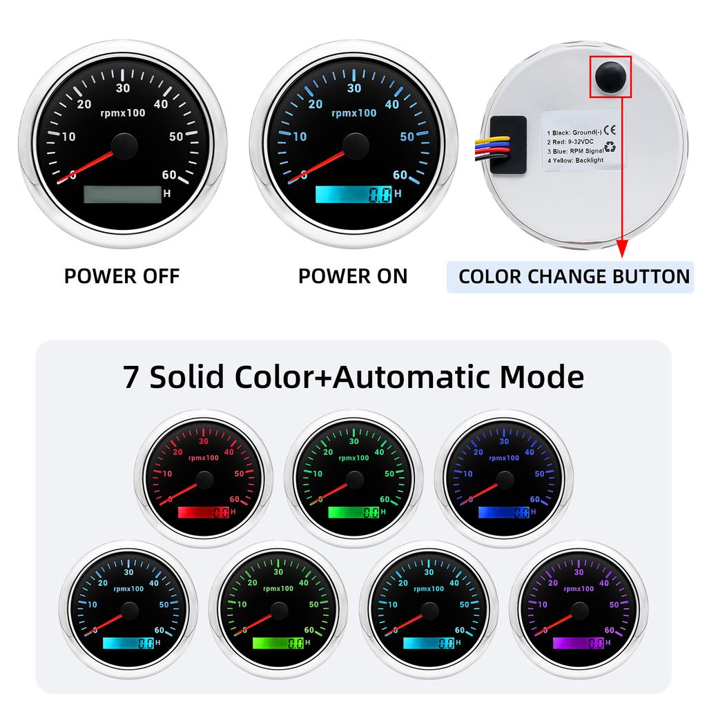 85mm Tachometer With LCD Hourmeter For Marine Boat Car 3000/4000/6000/8000 RPM Tacho Gauge 7 Color Backlight Digital Display