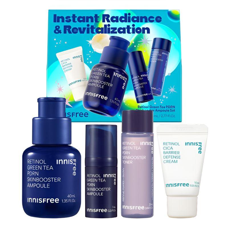 A holiday skincare ampoule set featuring Retinol, Green Tea, and PDRN-based booster formulas designed for layered skincare routines.