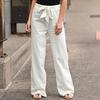 Women Polyester Cotton Pants Autumn Casual Solid Elastic Waist Straight Trousers Loose Long Pants Wide Leg Trousers