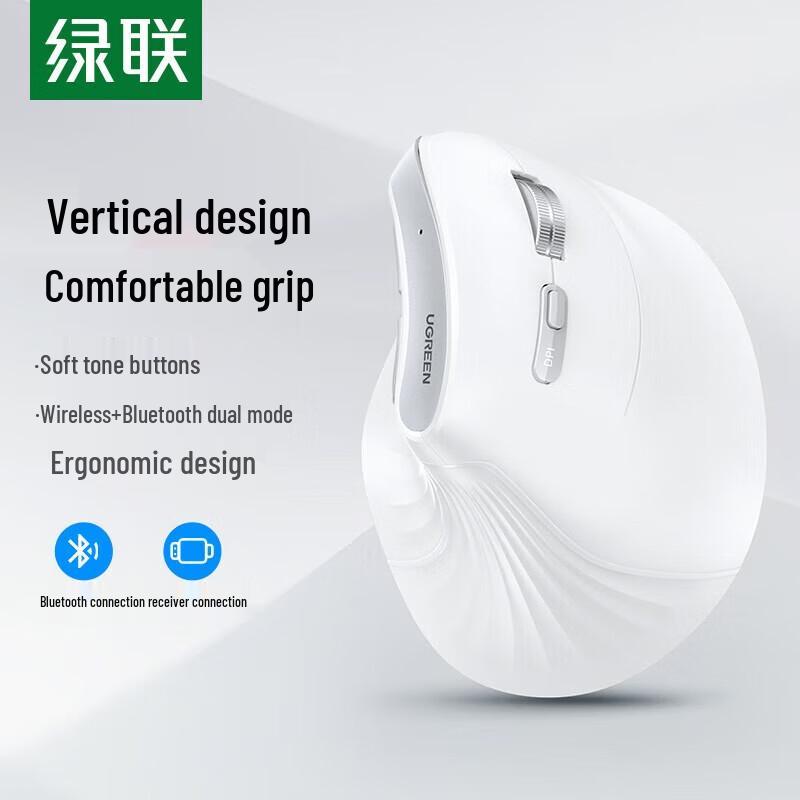 Experience ultimate comfort and productivity with the Ugreen MU008 Ergonomic Vertical Mouse. Designed to prevent 'mouse hand' (RSI), this right-handed mouse features dual-mode connectivity, supporting both 2.4G wireless and Bluetooth for seamless connection to two devices. Its vertical grip and silent clicks ensure a comfortable and quiet working environment. Ideal for large hands and compatible with multiple operating systems, making it perfect for office or home use.