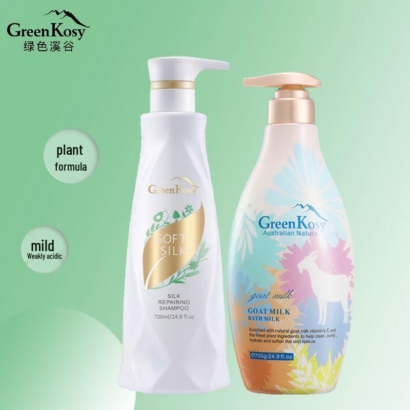 Indulge in a luxurious hair and body care routine with the Green Valley Silky Repair Shampoo and Goat Milk Silky Shower Gel Set. The shampoo is specially formulated to smooth, repair, and reduce frizz, leaving normal hair soft, luminous, and healthy-looking. Paired with the moisturizing Goat Milk Silky Shower Gel, which leaves skin feeling smooth and supple, this set provides a complete nourishing experience for both your hair and body. Each set contains 700ml of shampoo and 700g of shower gel, ensuring long-lasting care.