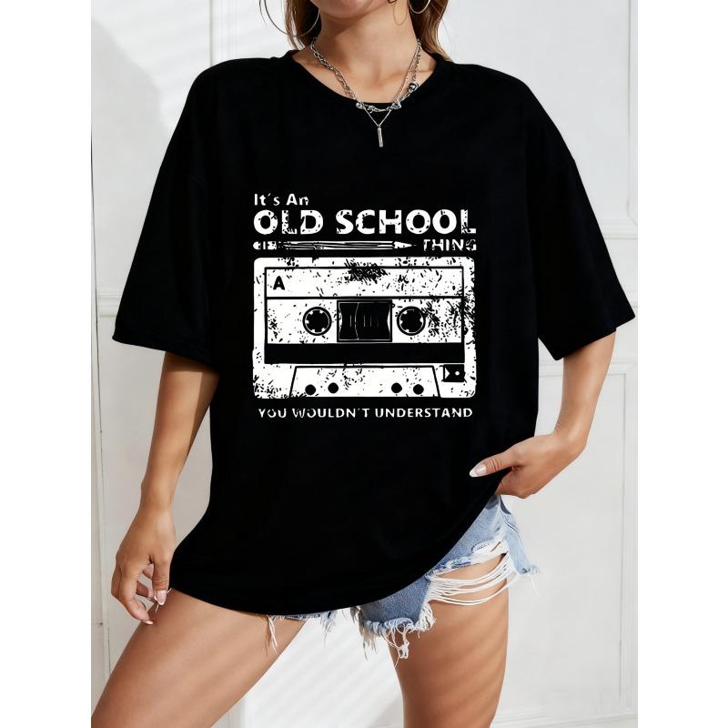 White Oversized T-Shirt With Old School Cassette Tape Graphic And Text For Casual Wear
