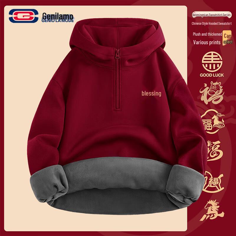GENIOLAMODE Chinese New Year Half-Zip Fleece Lined Hooded Sweatshirt