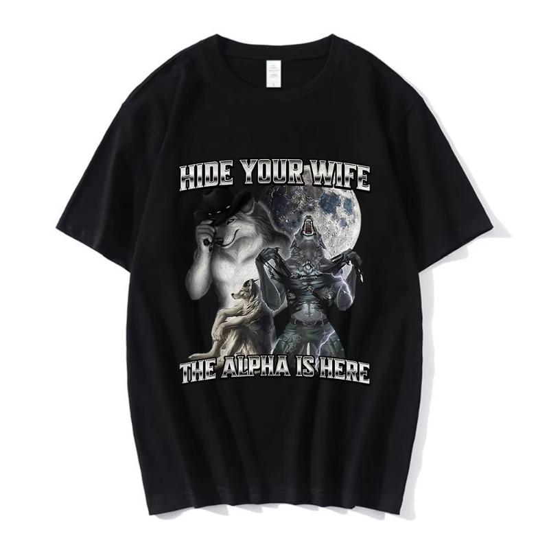 Hide Your Wife The Alpha Is Here Funny Wolf Meme T-shirts Men Women Clothing Fashion Hip Hop T-shirt 100% Cotton Casual T Shirts
