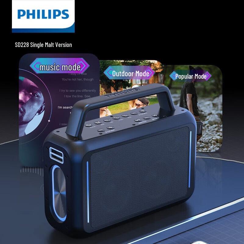 Experience powerful and portable karaoke with the Philips SD228 speaker. This high-power, handheld system features TWS stereo sound, a wireless microphone for singing, and convenient remote control. Enjoy seamless audio via Bluetooth 5.0, USB playback, and a built-in rechargeable battery for on-the-go entertainment.