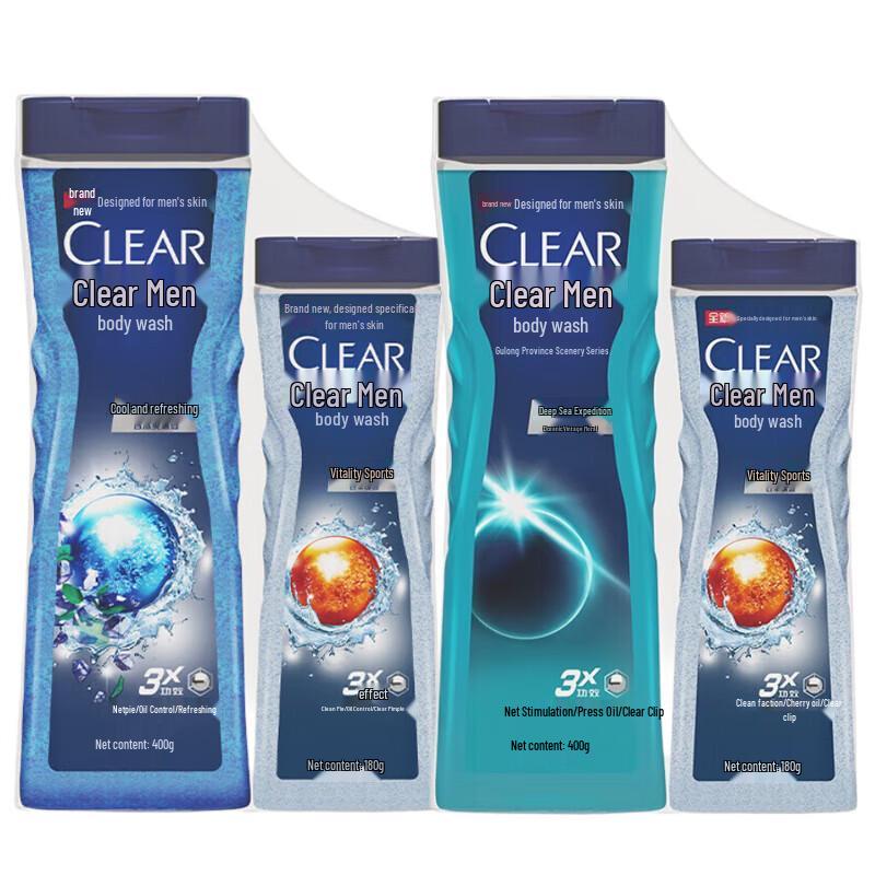 Discover an invigorating shower experience with the Clear Men's Shower Gel Combo Pack, featuring Cooling Vitality and Deep Sea Vitality formulations. This special offer includes two complete sets, each comprising a 400g and a 180g bottle for a total of four bottles. Designed for various skin types, these shower gels provide effective cleansing, moisturizing, hydrating, and refreshing benefits, leaving you feeling clean and revitalized.