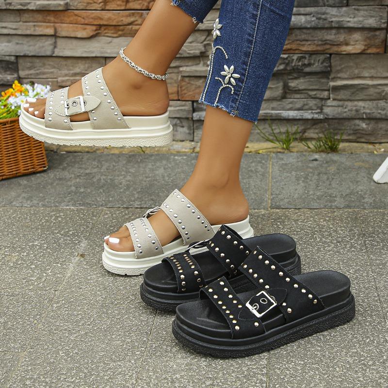 Spot cross-border large-size flat-bottomed slippers summer new wide strip buckle with rivets European and American cool slippers women