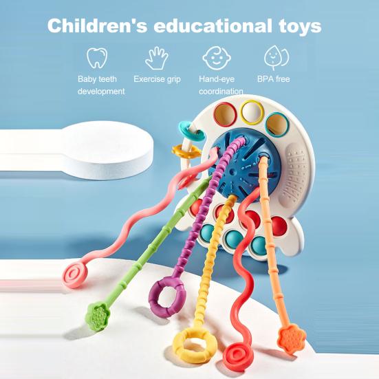 Multifunctional Montessori Pull Cord Toy: Equipped with sliding buttons, push bubbles, a soft textured rope, and easy-to-grip handles, this toy encourages sensory exploration and hand-eye coordination. Its vibrant colors stimulate visual development while helping babies aged 6 to 12 months learn color recognition and auditory skills through interactive play.