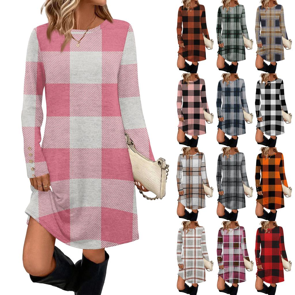 Rochie Casual de Damă la Modă Cu Buzunar, Nasturi Decorativi, Gât Rotund și Mâneci Lungi