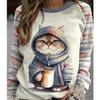 Tricou casual cu mânecă lungă Harajuku cu imprimeu 3D cu pisică și gât rotund