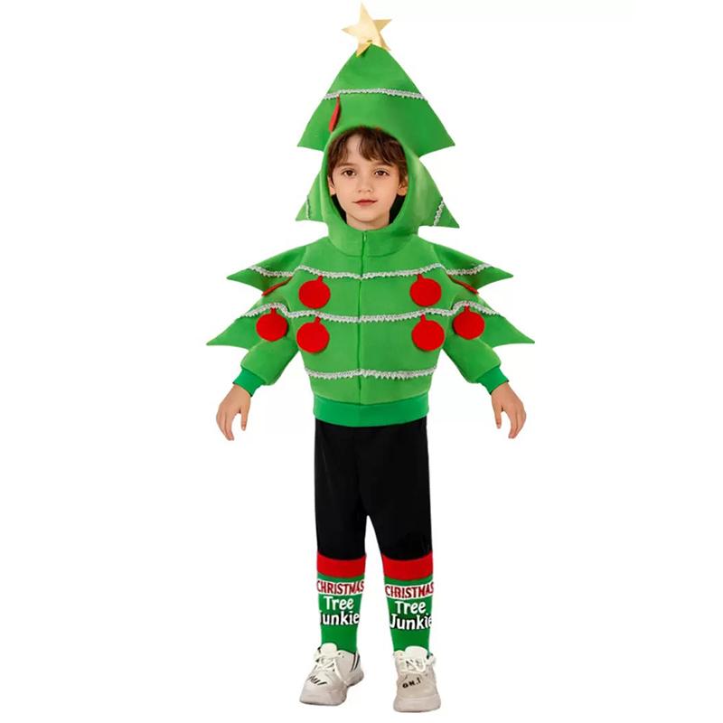 This kids Christmas Tree cosplay costume is a vibrant “Christmas Tree cos outfit” designed as a children’s party play costume, perfect for Christmas gatherings, holiday parties, or festive activity events where kids want to embrace the cheerful, festive vibe of a decorated Christmas tree. The costume features iconic Christmas tree elements: a green, tiered hooded top (shaped like a tree silhouette), red pom-pom “ornaments,” white lace trim (mimicking tinsel), and a golden star on the hood’s tip—all paired with themed pants (printed with “Christmas Tree Junkie” text) to create a cohesive, playful look.