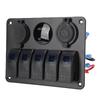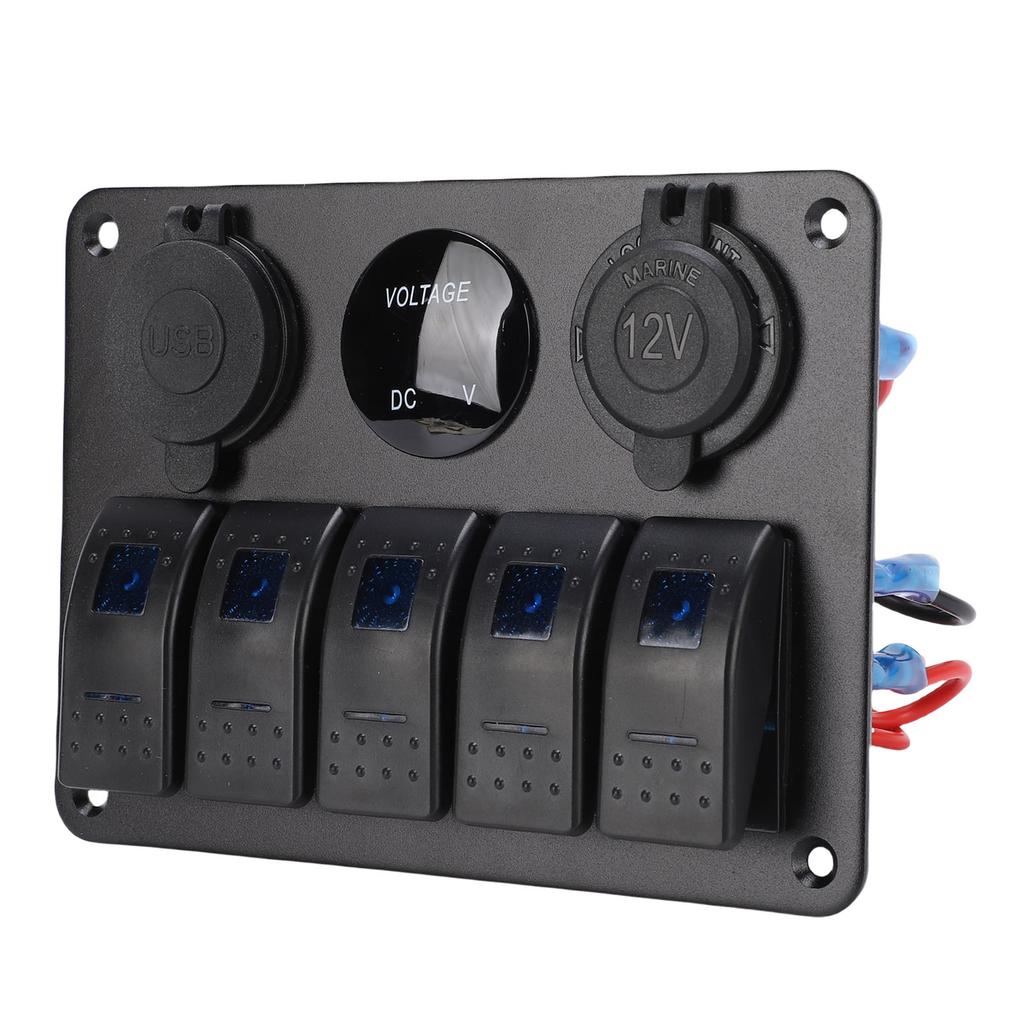 5 Gang Rocker Switch Aluminum Panel with Blue Backlight Dual USB Ports Volt Meter Waterproofing On Off Toggle Switch