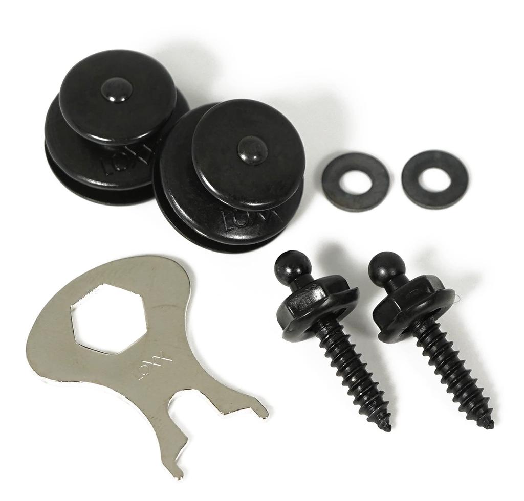 The set includes the strap lock itself, a key for easy installation, a plate for securing it to the back of the headstock, a drill bit for drilling screw holes, and felt pads to protect the guitar from the strap lock's movement.