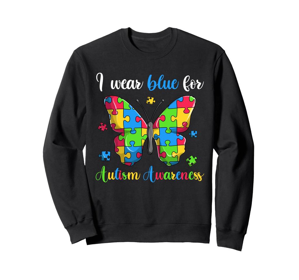 This awesome Autism Colorful Puzzle Piece Butterfly reads "I Wear Blue For Autism Awareness." Graphic design apparel for boys, girls, and kids is the perfect Autism Superpower Positive Vibes t-shirt to wear during April for Autism Awareness.