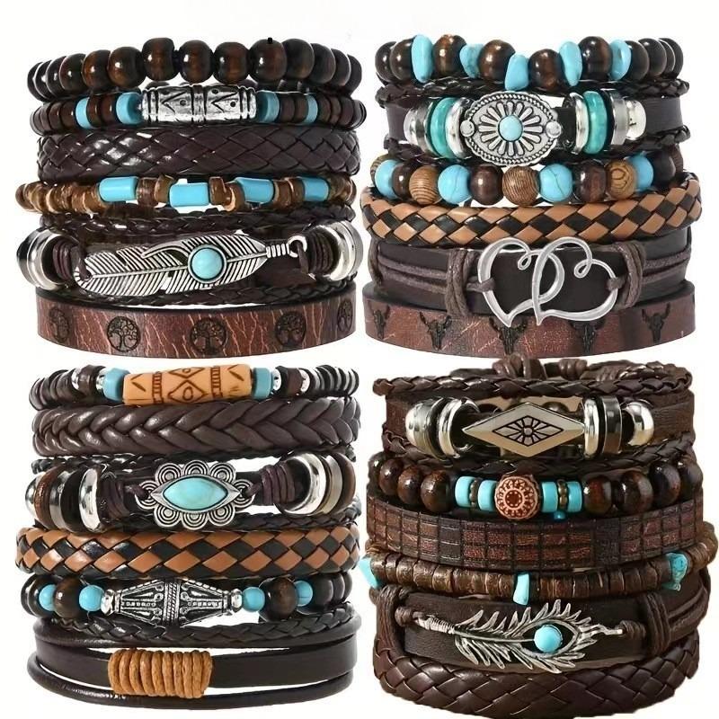 Leather Bracelets Set: Package contains classic leather braided bracelets, including black leather bracelets, wooden beads bracelets, hemp cords bracelets, life of tree pendent bracelets, and ethnic tribal bracelets.