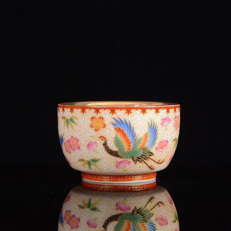Gilded Ceramic Gongfu Teacup with Pine & Crane Design