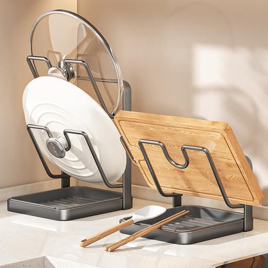 Multi-Functional Storage Solution: Featuring a deep ABS drain tray that doubles as a storage compartment, this holder accommodates not only pot lids but also utensils like spoons and measuring tools. It effectively expands your kitchen organization by consolidating small items in one accessible spot.