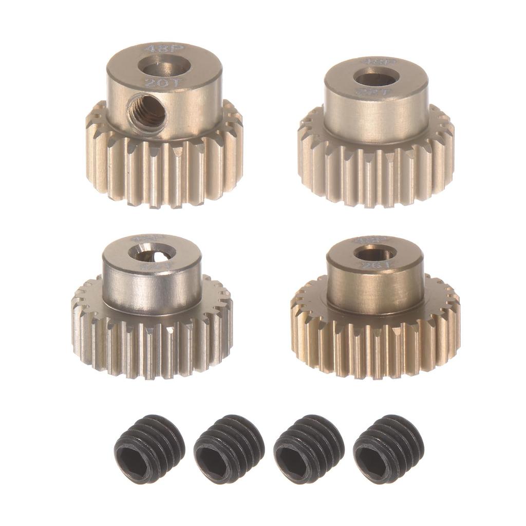 Package Contents: 4 x 20T, 22T, 24T, and 26T pinion gears, and 4 x Grub Screws.