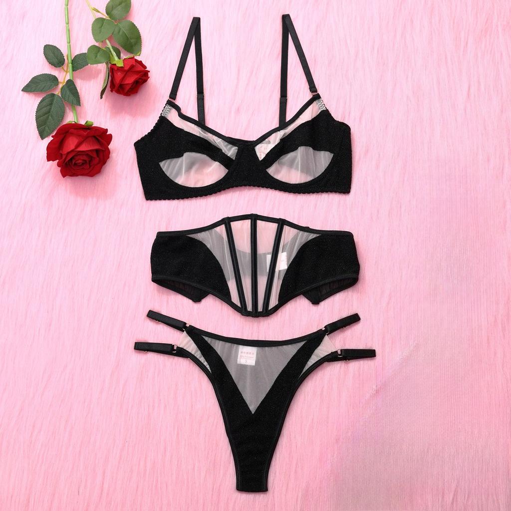 Sexy Mesh Lingerie Sets Erotic Costumes For Women Transparent Contrast Color Tulle Patchwork Bra Thong Garter Belt Set Underwear