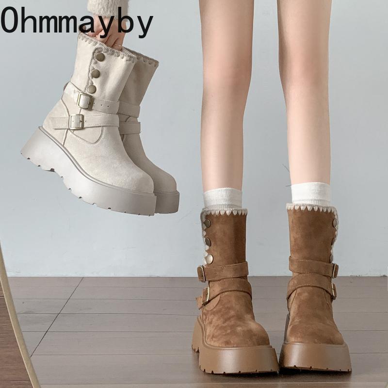 Vintage Chunky Platform Flats Women Ankle Boots Fashion Belt Buckle Height Increase Shoes Autumn Winter Women's Short Booties