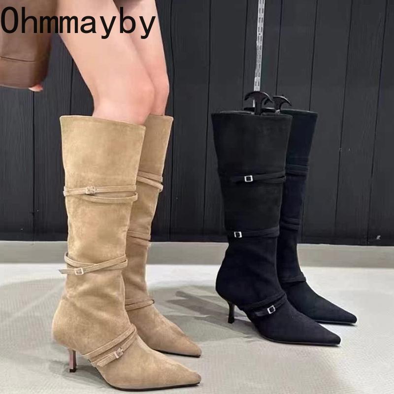 Vintage Suede Women Knee High Boots Fashion Pointed Toe Shoes Autumn Winter Thin Heel Ladies Short Plush Long Booties
