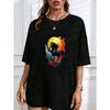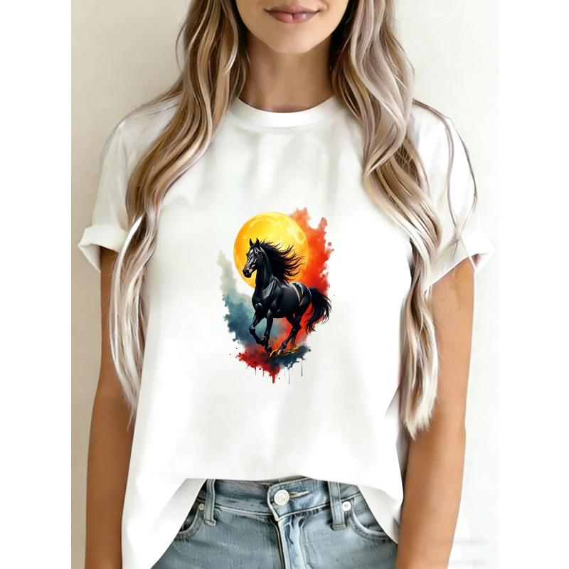 Women Casual Short Sleeve T Shirt White Black Horse And Moon Print For Everyday Wear