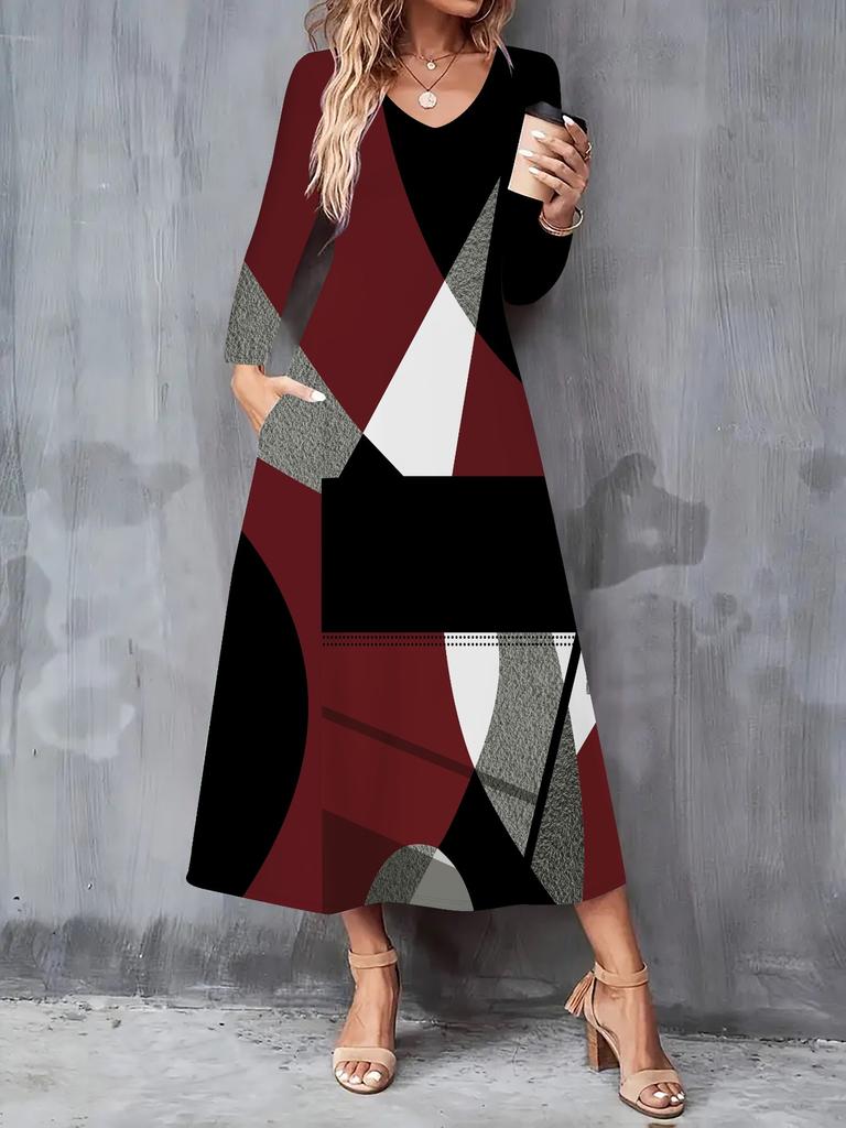 Rochie nouă de toamnă și iarnă 2025 pentru femei, casual, la modă, cu imprimeu geometric 3D, mâneci lungi, decolteu în V, rochii A-line