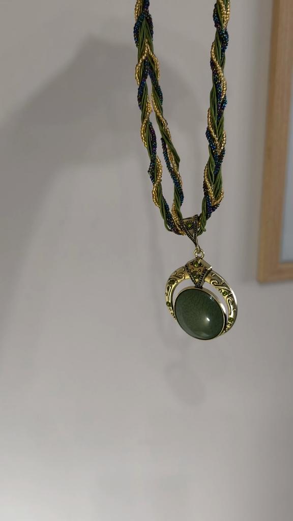 Acest colier din mărgele de orez țesute manual este o piesă care se remarcă prin designul său unic și caracterul său boem pronunțat. Pandantivul central, cu o piatră rotundă în nuanțe de verde și detalii ornamentale în relief, adaugă o notă vintage și sofisticată care pune în valoare orice ținut casual. Fiind un accesoriu unisex, oferă o mare versatilitate pentru a se adapta diferitelor stiluri personale, devenind punctul central al oricărei ținute.. Combinația de mai multe șiraguri de mărgele țesute oferă o textură bogată și o mișcare naturală foarte flatantă la purtare. Este un accesoriu ușor, dar puternic vizual, ideal pentru cei care apreciază bijuteriile cu finisaje ce evocă munca manuală. O alegere perfectă pentru a adăuga o notă de culoare și distincție etnică colecției tale zilnice de bijuterii, fără a renunța la confort.