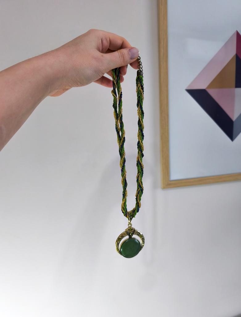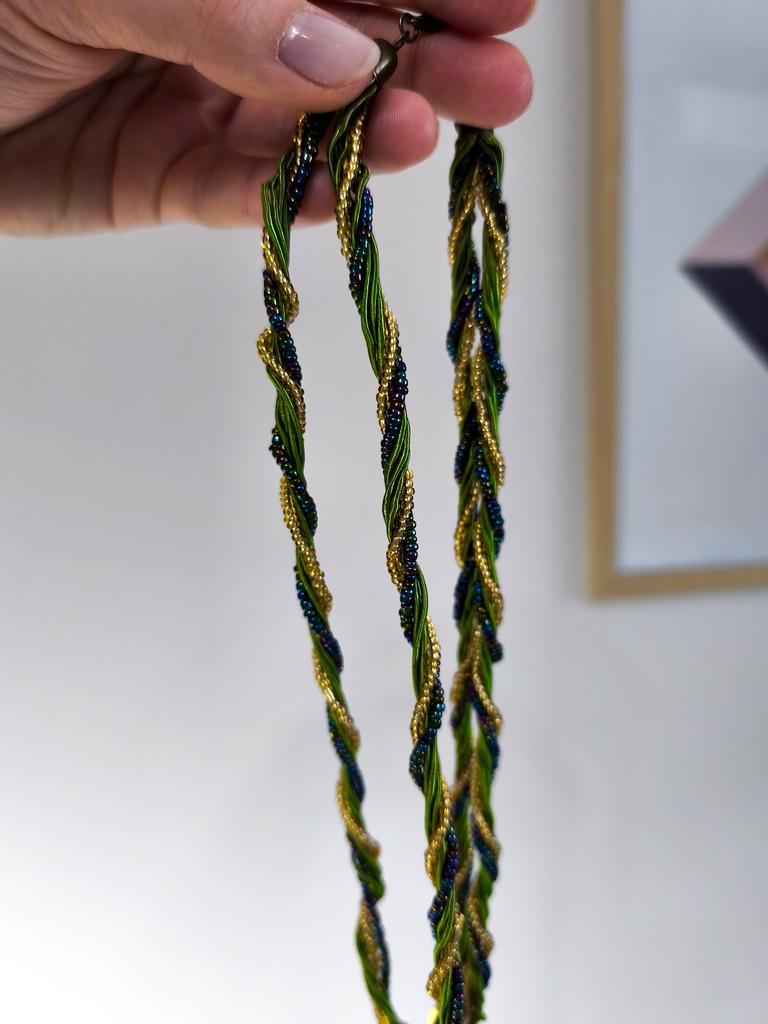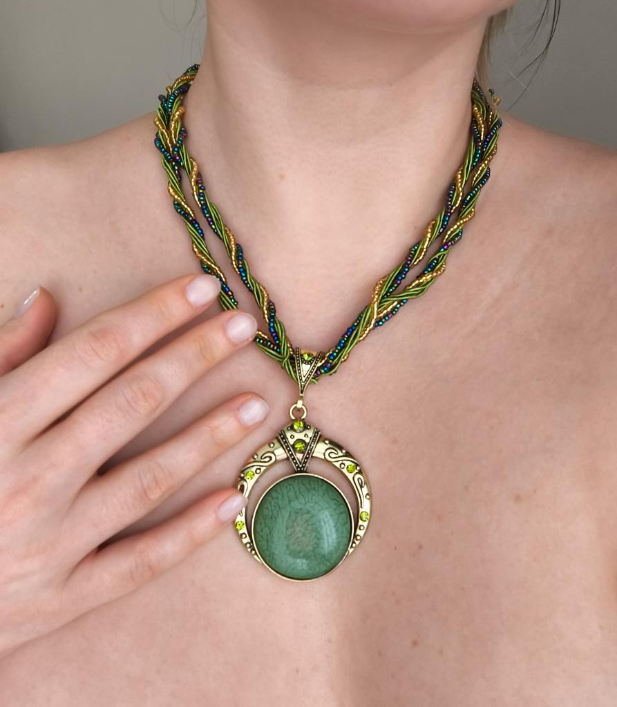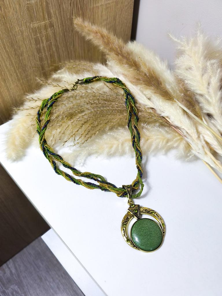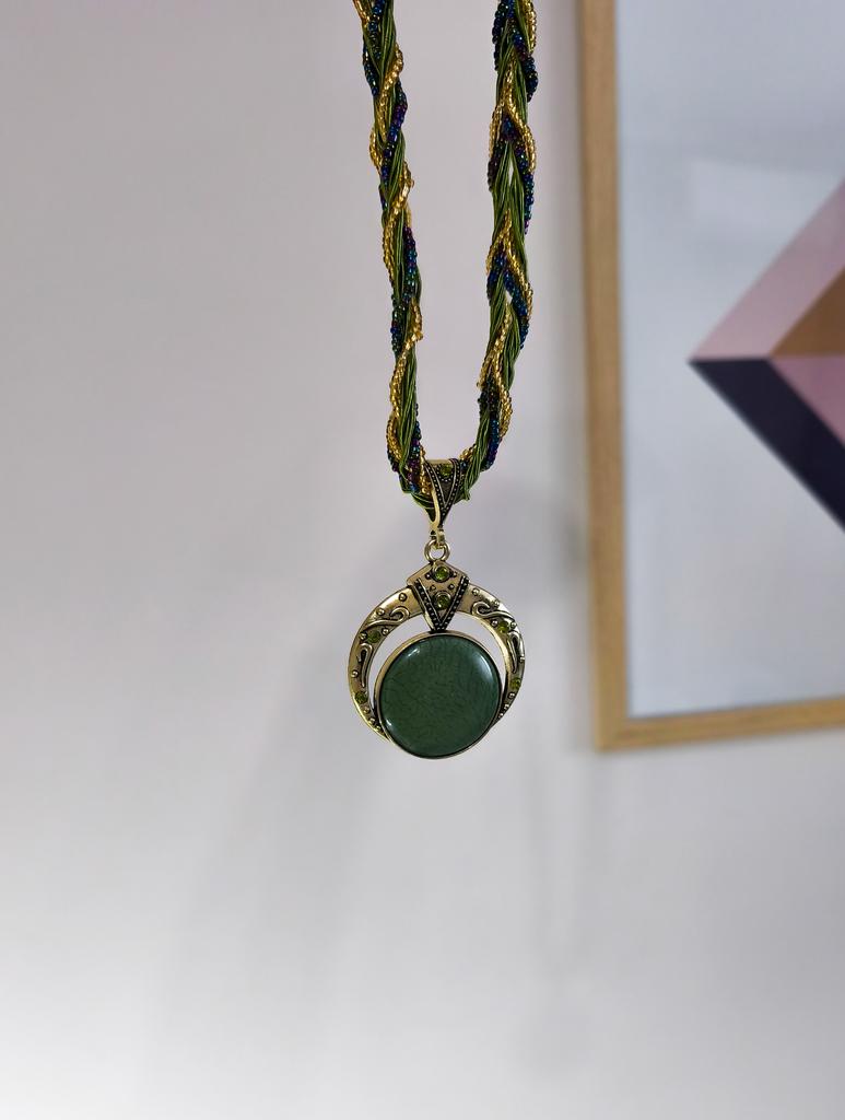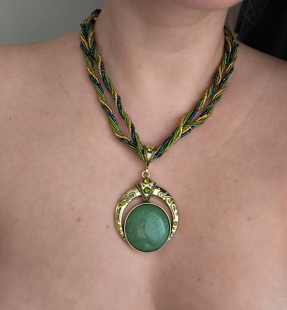 Colierul „Luna plină de malahit” Design și textură: 🔸Stratificare: Baza este realizată din mai multe șnururi împletite de culoare verde, aurie și albastru irizat, ceea ce creează o textură bogată. 🔸Punctul central: Pandantiv rotund mare cu o piatră de culoare verde intens, imitând malachitul sau turcoaza, încadrată de metal auriu sculptat. 🔸Detaliere: Montura pandantivului este decorată cu cristale verzi mici și un ornament vintage, conferind bijuteriei un caracter artizanal. Concluzie: O bijuterie îndrăzneață și stilată pentru cei care iubesc nuanțele naturale și accesoriile complexe, detaliate.