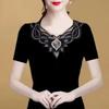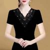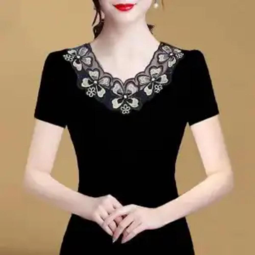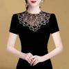 Elegant Black & Golden Floral Lace Beaded Embroidery Blouse Sheer Short Sleeve Fitted Summer Top for Women