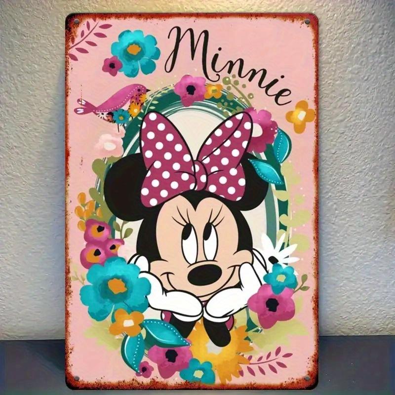 2D Flat - 1pc Minnie Mouse Floral Tinplate Wall Art - 12x8 Inch Metal Sign with Pink Bow & Multicolor Flowers, Vintage Home Deco