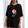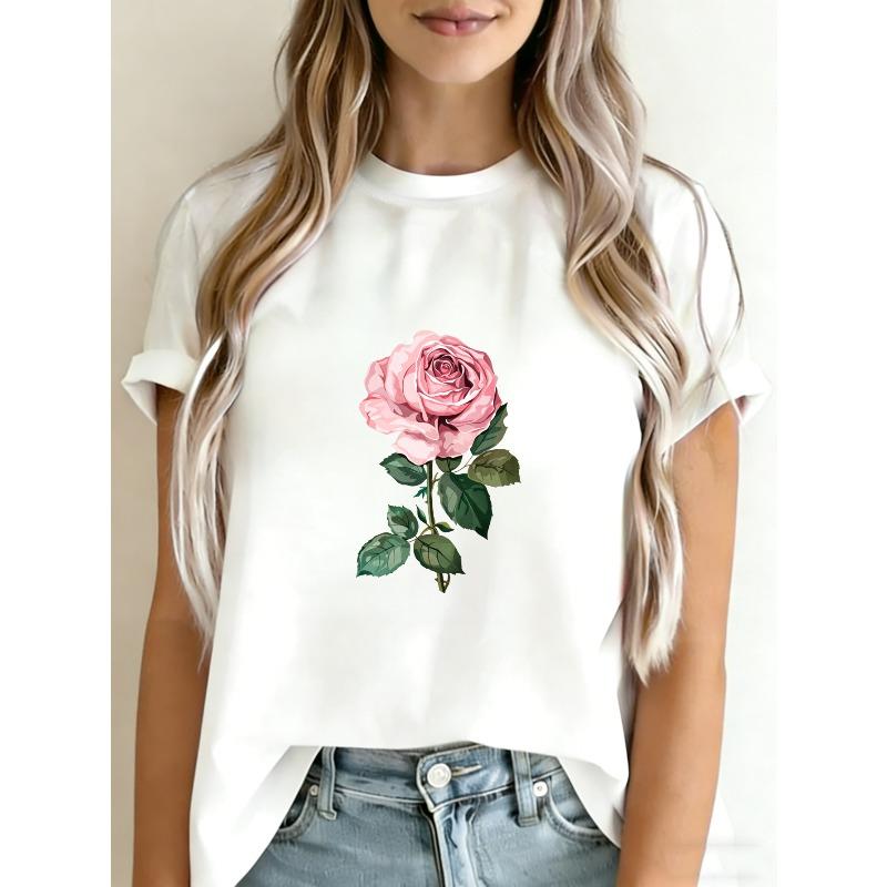 White T Shirt With Pink Rose Floral Print For Casual Wear