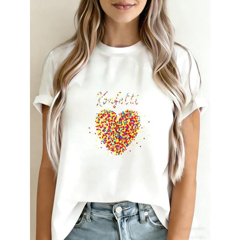 White T-Shirt With Confetti Heart Print And Text For Casual Wear