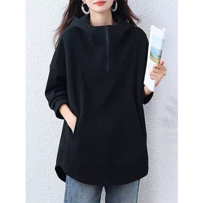 Half-zip Hooded Sweatshirt for Women Autumn and Winter Korean Style Loose Casual Mid-length Black Top