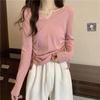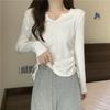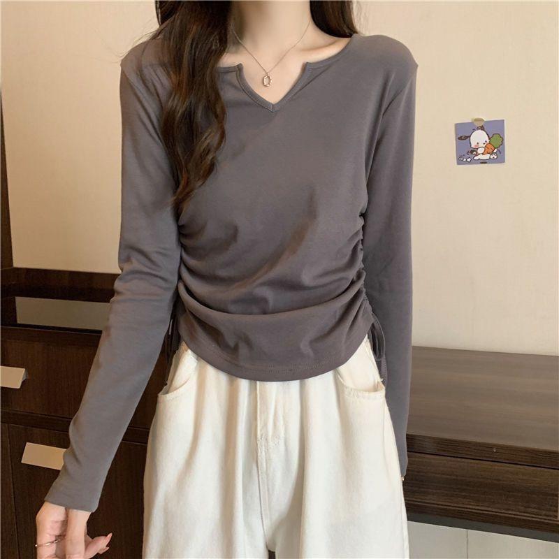 Women's Design Drawstring V-neck T-shirt Early Spring Autumn Short Style Covering the Belly Slimming Long Sleeves Trendy