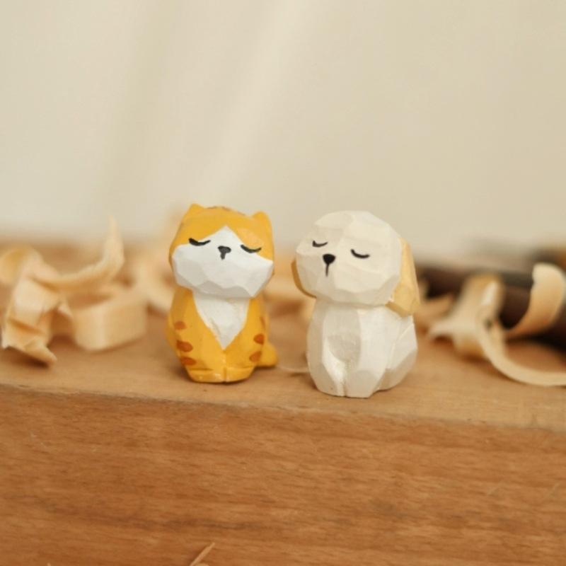 Basswood Handmade Wooden Carving Orange Cat Dog Rabbit Sheep Figurine Ornament Cute Desktop Home Living Room Decor New Year Gift