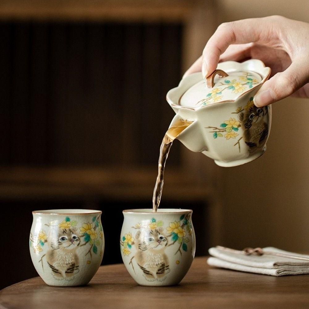 Chinese Style Ru Kiln Gaiwan Ceramic Hand Grasping Tea Maker Cute Cat Tea Tureen Home Decor