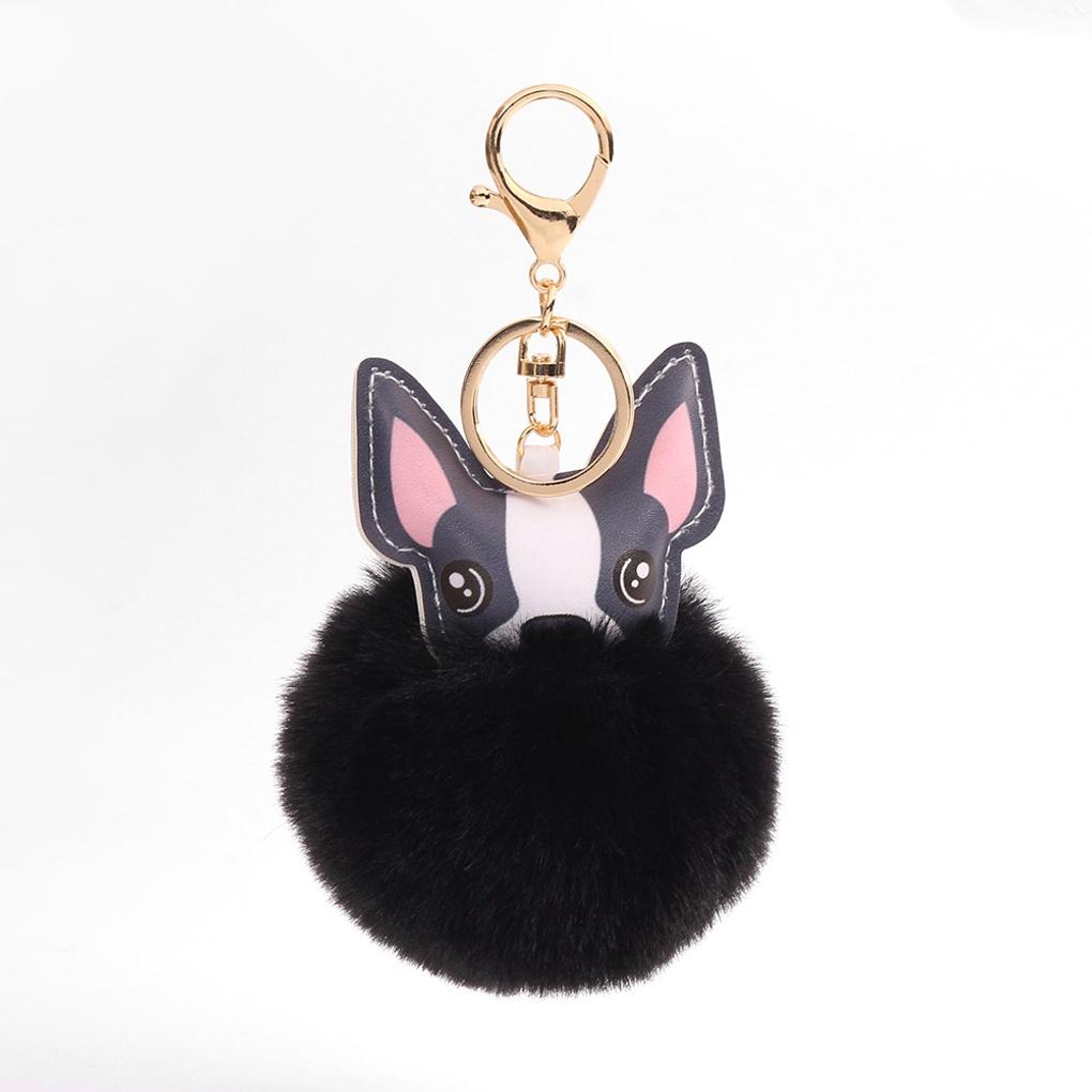 Bulldog Pom Pom Keyring (Black) Bag Decoration Car Perky Ring