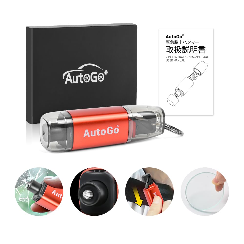 (1 Second Escape Hammer) The AutoGo car emergency escape hammer uses a design that pops out the tip, so you push it directly onto the glass and grind it into shatters in a moment. It escape for 1 second when the door is not opened due to being submerged or fire, etc. AutoGo safety hammer adopts high quality alloy material and large spring loaded to easily break window glass for 1 second and get out quickly in an emergency. Package Includes: AutoGo Emergency Escape Hammer (with Seatbelt Cutter) x 1, Test Glass x 2, Japanese / English Instruction Manual, Test Protection Bag, Storage Case
