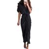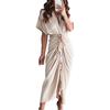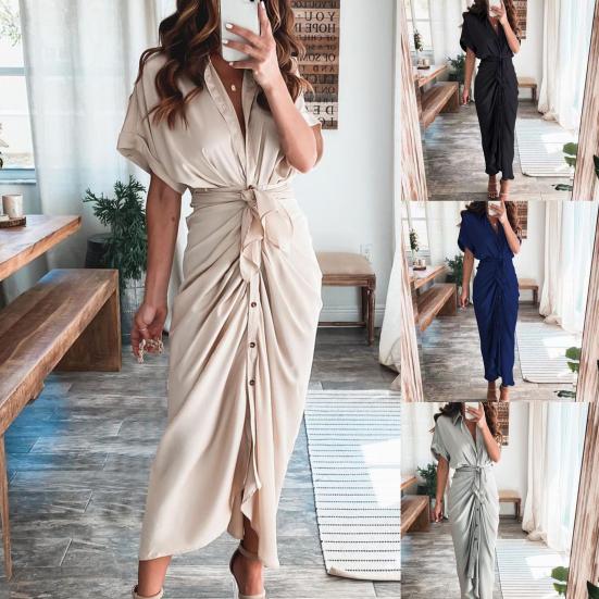 Office Lady Maxi Dress Turn Down Collar Ruched Solid Color Short Sleeve