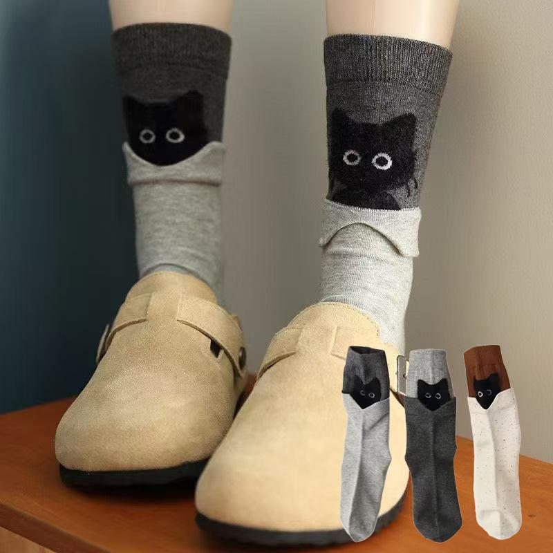 Korean Style Trendy Sweet Cute Soft Cotton Socks Women's Color-blocked 3D Cartoon Kitten Mid-calf Socks